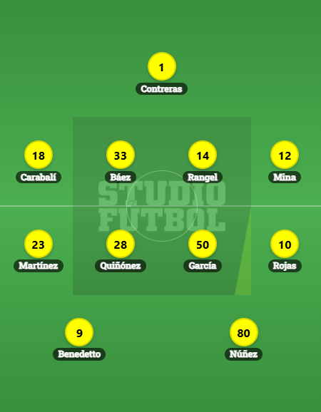 Con ese enfoque, el posible once que se maneja es: Contreras, Carabalí, Báez, Rangel, Mina, Martínez, Quiñónez, García, Rojas, Benedetto y Núñez.