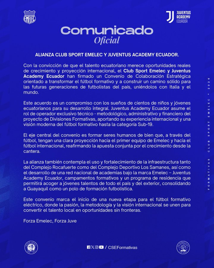 Club Sport Emelec oficializó una alianza estratégica con Juventus Academy Ecuador con el objetivo de fortalecer el fútbol formativo, impulsar el desarrollo integral de sus jóvenes talentos y abrir oportunidades de proyección internacional. El club presentó el acuerdo como el inicio de una etapa enfocada en metodología, estructura y crecimiento desde la cantera.