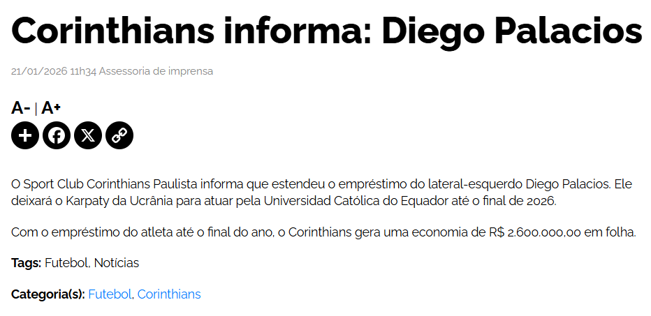 Diego Palacios estaría próximo a convertirse en nuevo jugador de Universidad Católica. Medios brasileños señalan que Corinthians tomó la decisión de ceder al lateral izquierdo ecuatoriano, en un préstamo que se extendería hasta el cierre de la temporada 2026, con un impacto directo en la nómina del club paulista, que proyecta un ahorro de R$ 2.600.000.