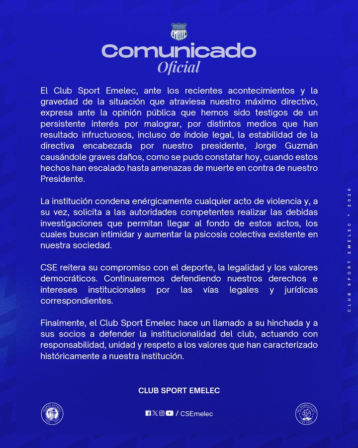 » La institución condena enérgicamente cualquier acto de violencia y, a su vez solicita a las autoridades competentes realizar las debidas investigaciones que permitan llegar al fondo de estos actos, los cuales buscan intimidar y aumentar las psicosis colectiva existente en nuestra sociedad». También señaló: » CSE reitera su compromiso con el deporte, la legalidad y los valores democráticos. Continuaremos defendiendo nuestros derechos e intereses institucionales por las vías legales y jurídicas correspondientes». Finalmente, cerró con un llamado: «Finalmente, el Club Sport Emelec hace un llamado a su hinchada y a sus socios a defender la institucionalidad del club, actuando con responsabilidad, unidad y respeto a los valores que han caracterizado históricamente a nuestra institución».