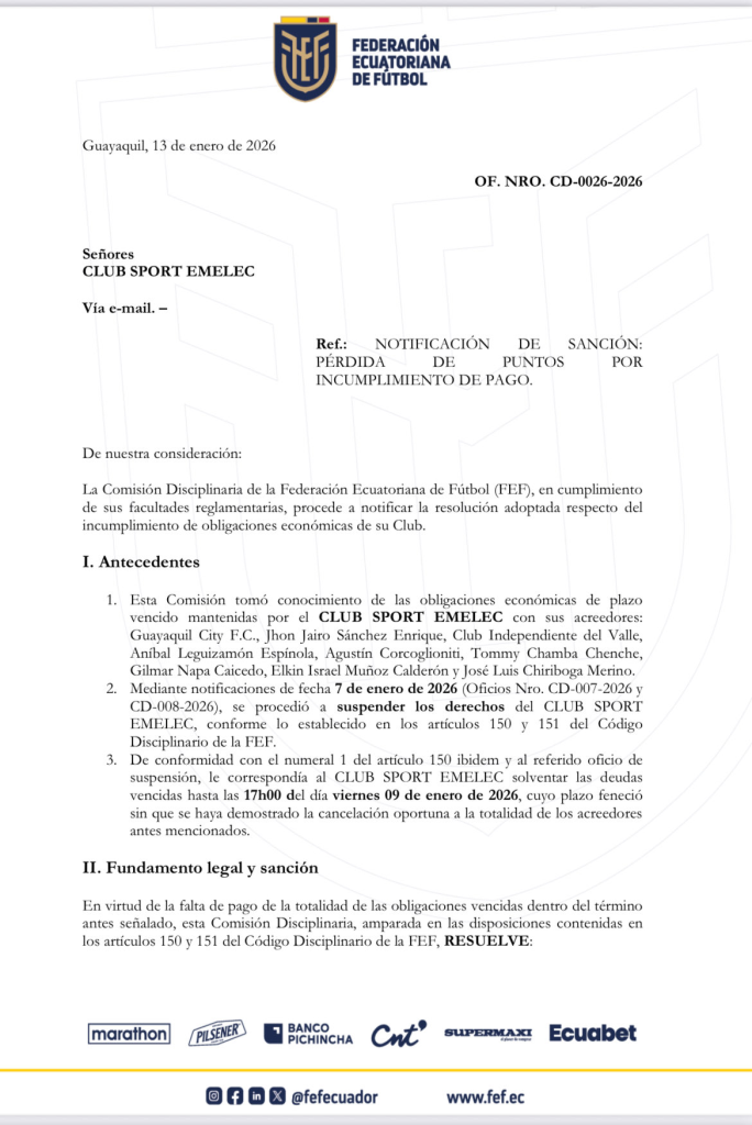 Según el oficio del 13 de enero de 2026, la Comisión Disciplinaria adoptó la medida por incumplimientos de obligaciones económicas con varios acreedores. El documento señala que Emelec ya había sido advertido y tenía plazo hasta el 9 de enero de 2026 para cancelar la totalidad de los valores, pero no se acreditó el cumplimiento dentro del tiempo fijado.