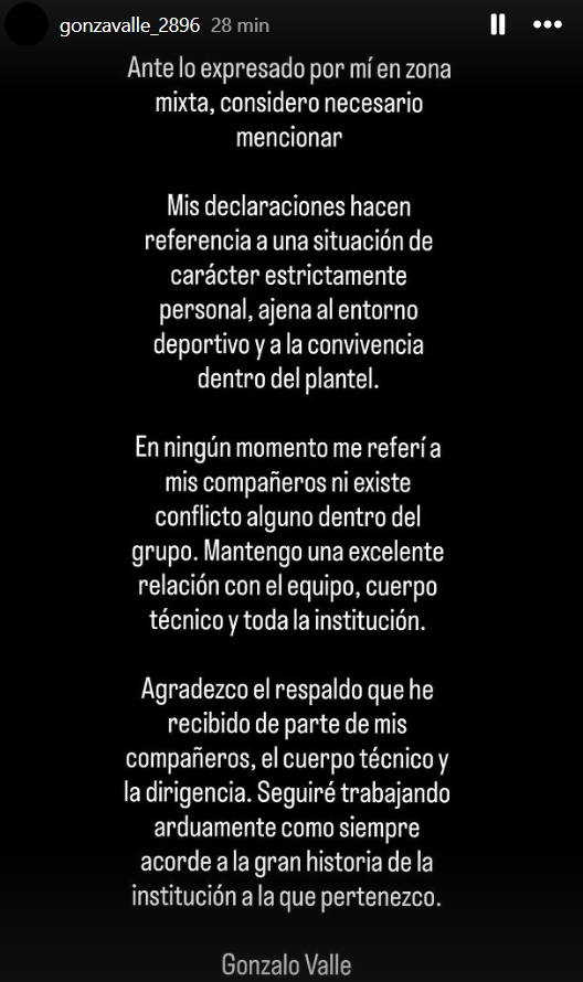 Horas después, Gonzalo Valle utilizó sus redes sociales para aclarar el alcance de sus palabras y evitar interpretaciones sobre una posible molestia con el plantel. El arquero explicó que sus declaraciones hacían referencia a una situación de carácter estrictamente personal, ajena al entorno deportivo y a la convivencia dentro del grupo.
