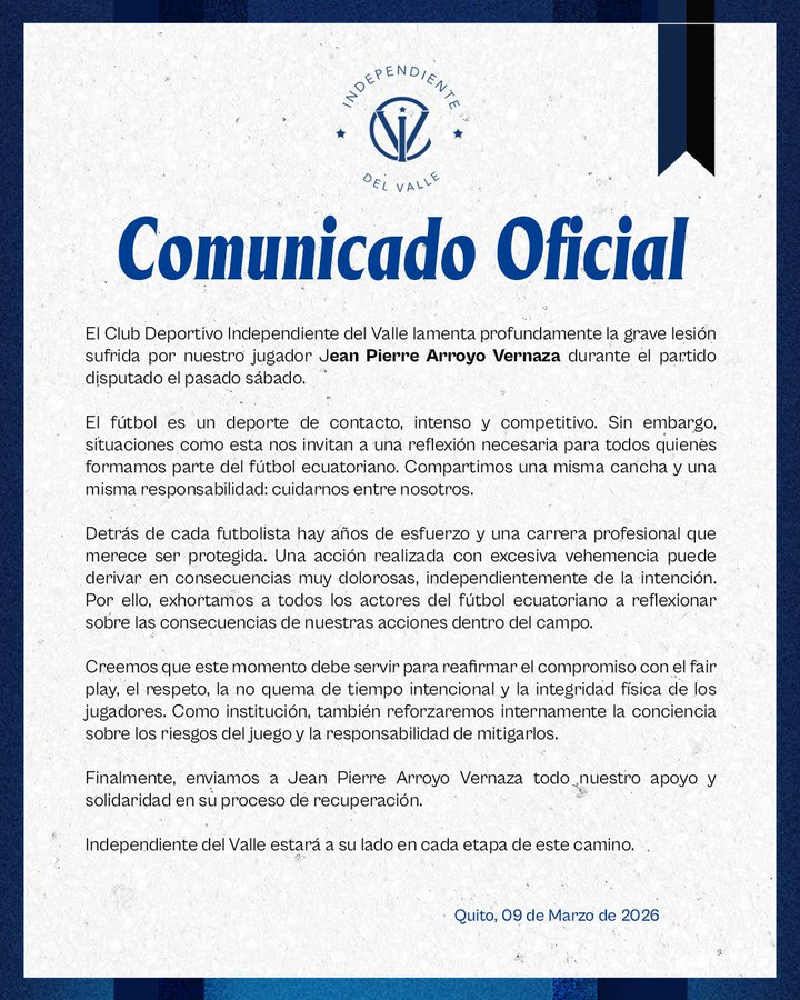 Independiente del Valle se pronunció oficialmente sobre la grave lesión que sufrió Jean Pierre Arroyo Vernaza durante el partido del pasado sábado. A través de un comunicado, el club expresó su preocupación por el estado del futbolista y dejó claro que contará con todo el respaldo institucional en esta etapa complicada.