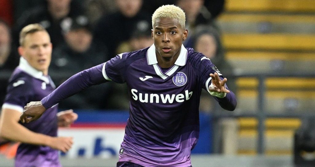 ANDERLECHT, BELGIUM - NOVEMBER 30: Nilson Angulo (19) of Anderlecht pictured during the Jupiler Pro League match between RSC Anderlecht and Royale Union Saint-Gilloise at Lotto Park on November 29, 2025 in Anderlecht, Belgium. (Photo by Isosport/MB Media/Getty Images)