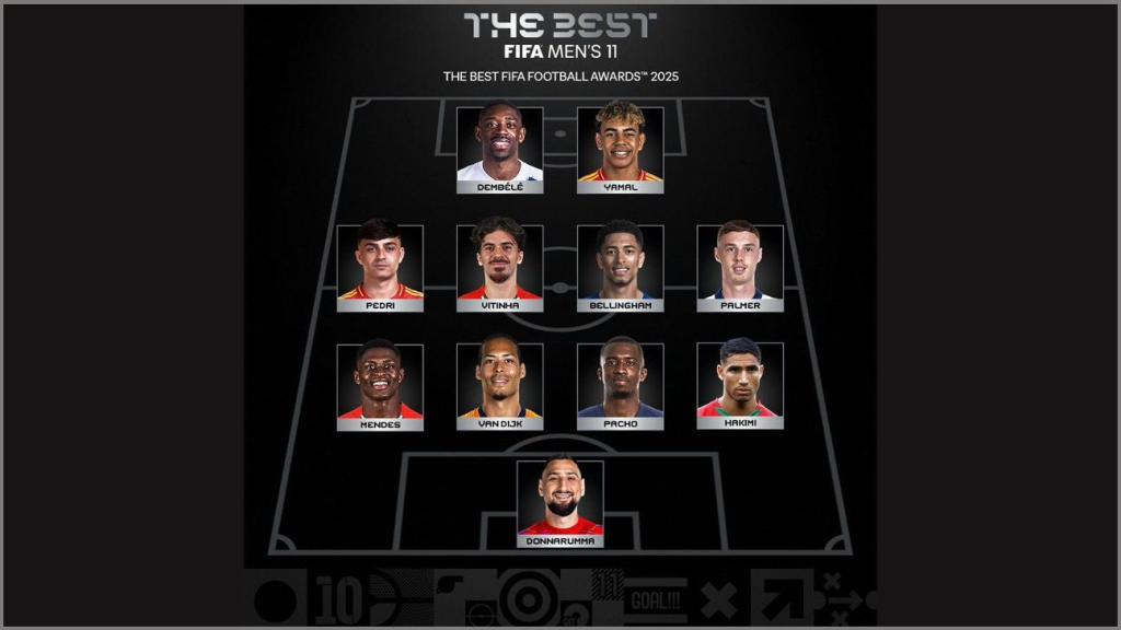 El once quedó conformado por Gianluigi Donnarumma en el arco; Achraf Hakimi, Willian Pacho, Virgil van Dijk y Nuno Mendes en defensa; Cole Palmer, Vitinha, Pedri y Jude Bellingham en el mediocampo; y Ousmane Dembélé junto a Lamine Yamal en ataque.